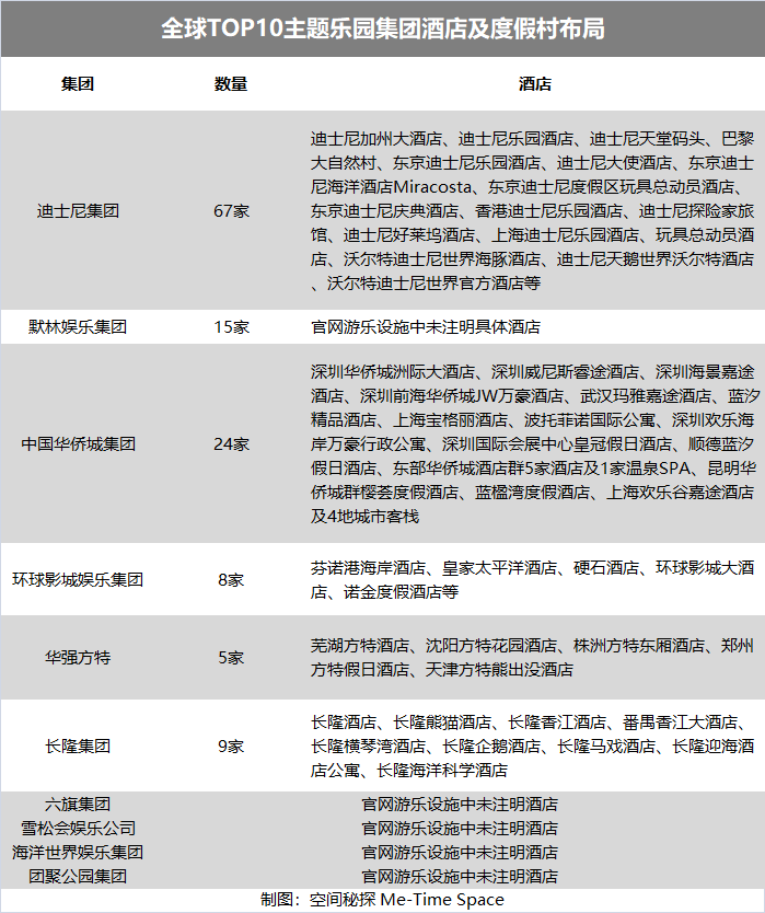 据空间秘探不完全统计,在全球TOP10的主题乐园集团旗下,共计有128家酒店。其中,在迪士尼、长隆、华强方特以及环球影城的官网上,都能见到清晰的“酒店住宿”列表,除了乐园直营酒店,还有一些合作酒店以及官方认证酒店,供消费者选择。而如六旗、雪松会、海洋世界和团聚公园等主题乐园集团,则未将酒店在 “设施列表”中明确标注。通过查阅这些主题乐园的配套布局不难发现,酒店版块正成为这些主题乐园产业的重要一环,但发展情况则有高有低。