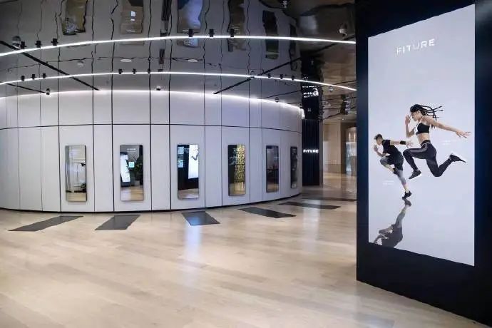 明亮的射灯照映下,一圈外弧形的墙面上,入嵌了六七张泛着金属光泽的“镜子”,每面镜子前都配备了一张瑜伽垫。这是4月10日在北京国贸商城新开业一家线下体验店,主打营造“科技感”的健身空间。
