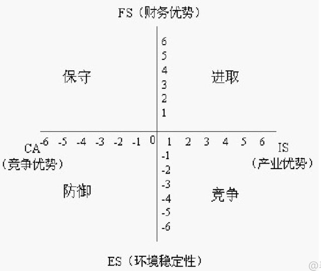 先简单科普一下,SPACE矩阵有四个象限分别表示企业采取的进取、保守、防御和竞争四种战略模式。两个数轴分别代表了企业的两个内部因素,财务优势(FS)和竞争优势(CA);两个外部因素:环境稳定性(ES)和产业优势(IS)。