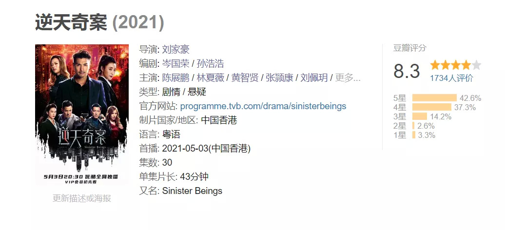 在这批30集左右的TVB“标准剧”中,只有近期在优酷同步播出的警匪剧《逆天奇案》取得了豆瓣开分8.3分的不错口碑。相比今年其他几部,观众对《逆天奇案》或许在一开始并没有多大期待——陈展鹏、黄智贤饰演的“O记双雄”不及欧阳震华、宣萱们的名气大,而TVB正统探案警匪题材产量较多,过去也出了不少庸作。因此《逆天奇案》能够在警匪这个TVB常规题材里能够让观众有点惊艳感,细想之下是并不容易的。