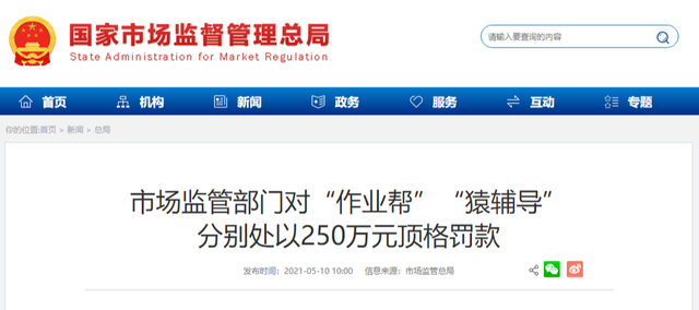 5月10日,北京市场监督管理局对作业帮、猿辅导分别处以250万元顶格罚款,两家头部在线教培企业均被指存在虚假商业宣传、诱骗消费者交易等行为。