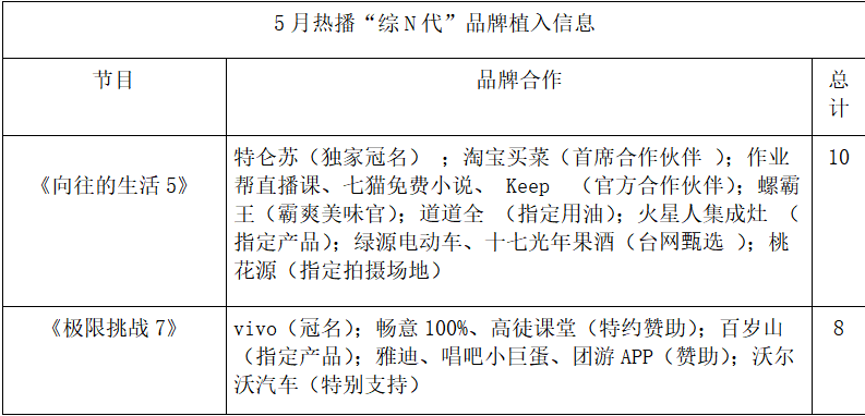 顺着《向往的生活5》把视线投到其背后的平台,文娱君观察发现,芒果系“综N代”在5月综艺市场不仅占比最高,整体的品牌合作成绩也最突出。