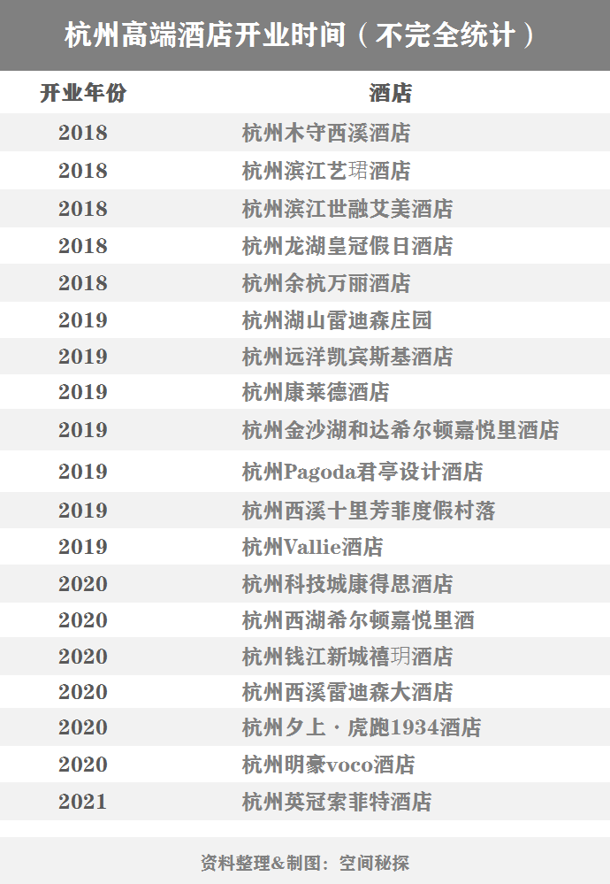 其一,是高频率的开业节奏。据携程数据统计,2018年开始,杭州便进入了高端酒店“喷发期”。以平均一年6家的开业速度,截至2020年底,3年时间开出了近20家高端酒店。