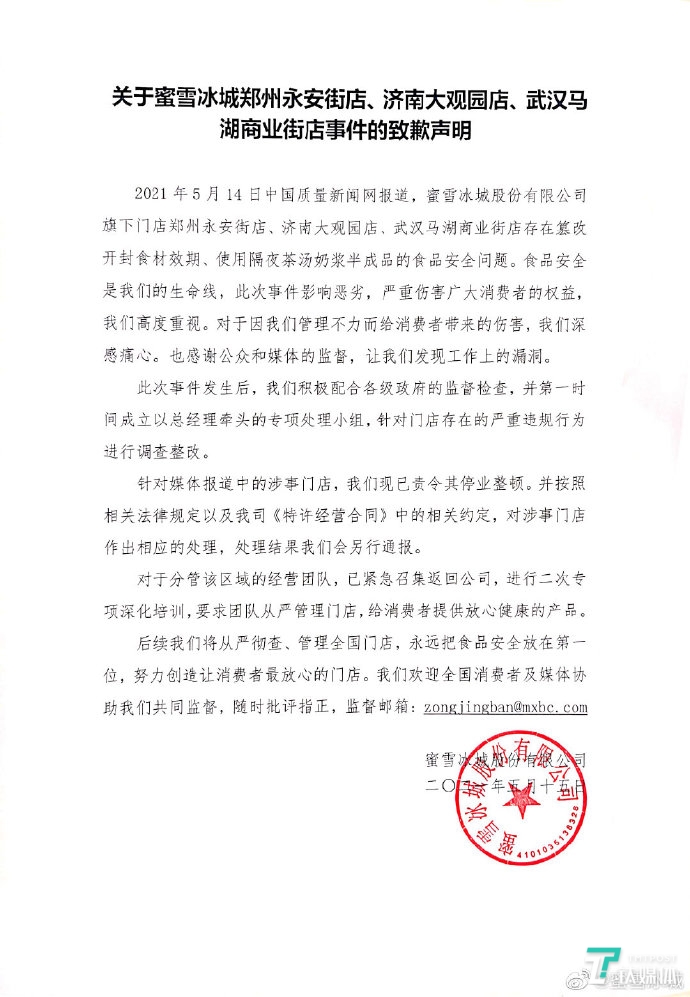 对此,蜜雪冰城表示,针对媒体报道中的涉事门店现已责令其停业整顿。并按照相关法律规定以及我司《特许经营合同》中的相关约定,对涉事门店作出相应的处理,处理结果我们会另行通报。对于分管该区域的经营团队,已紧急召集返回公司,进行二次专项深化培训,要求团队从严管理门店,给消费者提供放心健康的产品。