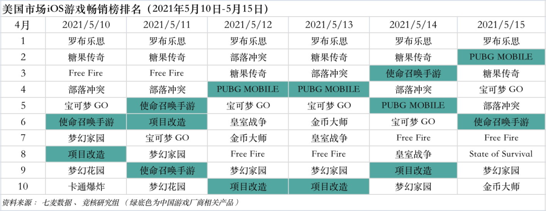 美国市场2021年5月10日—5月15日ios游戏类畅销榜中,与上周变化较小,其中腾讯《使命召唤手游》、《PUBG MOBILE》、米哈游《原神》以及时空幻境《项目改造》等进入榜单。