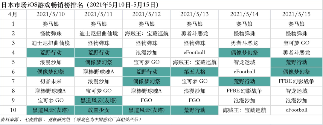 日本市场2021年5月10日—5月15日ios游戏类畅销榜中,网易游戏《荒野行动》、米哈游《原神》、乐元素《偶像梦幻祭》以及鹰角网络《明日方舟》等进入榜单。