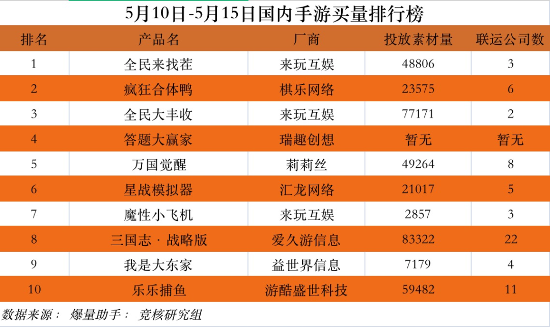 爆量助手数据显示,5月10日至5月15日买量榜单Top10中,《全民来找茬》登顶买量榜首,期内投放素材量高达48806组。