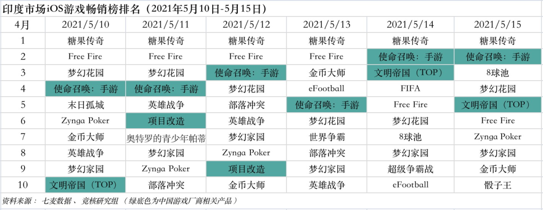 印度市场2021年5月10日—5月15日ios游戏类畅销榜中,《糖果传奇》登上榜首,而上周榜首《文明帝国》排行大幅下降。