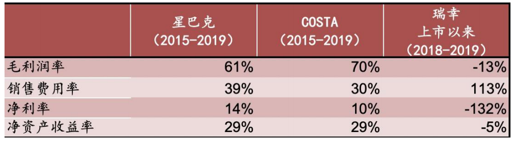 瑞幸咖啡较为特殊,以上市以来现有数据来看,虽然营收一直保持极高的增速,三年时间里门店数量逼近星巴克二十年来的布局,但是两项利润率都不好看,目前从商业模式和产品定价上看,仍达不到星巴克和 COSTA 同级别的利润率。
