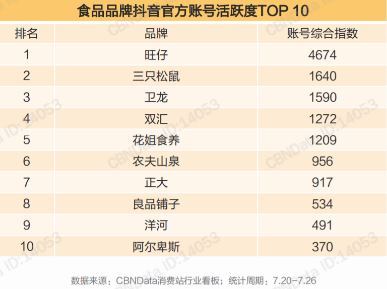 数据显示,2020年7月,抖音活跃度最高的食品品牌账号中,卫龙排名第三,播放量最高的视频的点赞量甚至达到了20.76万,和部分一线明星持平。