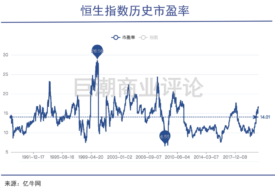 虽然长期经历暴涨暴跌,但香港市场的历史长期平均市盈率在14倍左右,与美国的约15倍左右、中国沪深300的13倍左右相差不大。