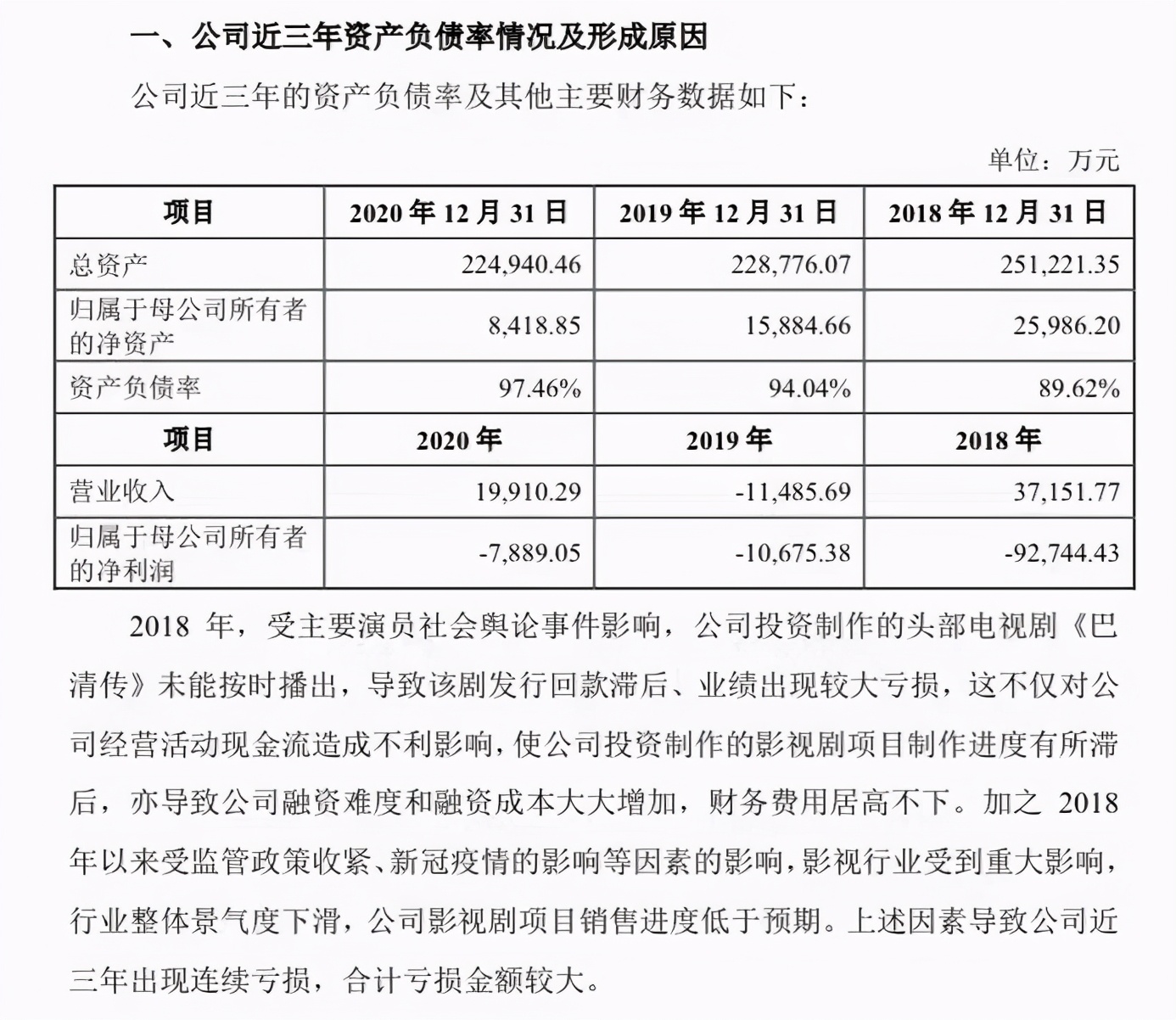 而唐德影视亏损的原罪,是《巴清传》。由于《巴清传》无法顺利播出,导致唐德影视回款滞后、业绩出现较大亏损。同时影视行业由于税务风波、阴阳风波等事件整体下行,2020年疫情黑天鹅则让行业集体停摆,唐德影视久久不能走出阴霾。