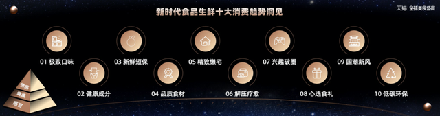 近日,在天猫举办的“全球美食盛宴”会上,发布了十大新趋势,分别为:极致口味、健康成分、新鲜短保、品质食材、精致懒宅、解压疗愈、兴趣破圈、心选食礼、国潮新风、低碳环保。
