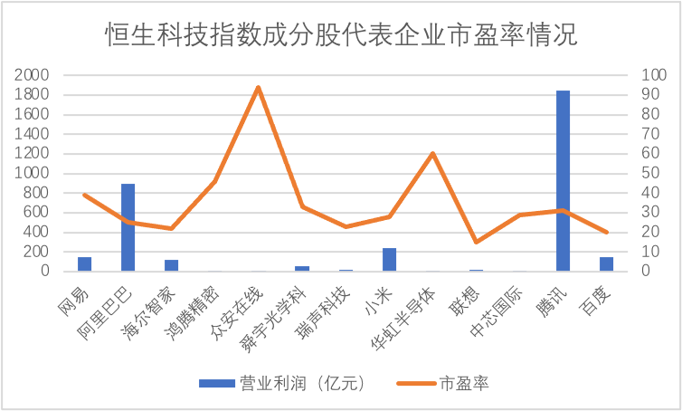 我们整理了恒生科技指数成分股中代表企业2020年经营性盈利以及市盈率情况,以判断百度的市盈率究竟是个案还是普遍现象,见下图