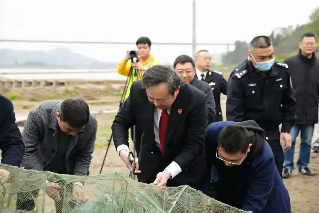 《长江保护法》落地的第一天,重庆市相关单位在大梁子码头进行法制宣传,并且集中销毁185件收缴的非法捕捞渔具。