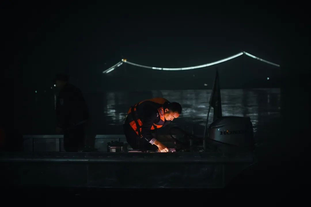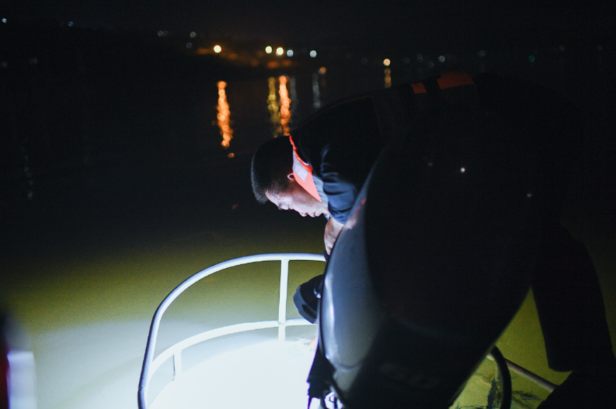 夜间巡航,最怕的是打草惊蛇,因此确定目标前,必须关掉一切光源,甚至连手机屏幕都不能亮起。零散分布的航标灯是深夜唯一的指引。红色表示浅滩,绿色代表礁石,两灯之间为航道……置身于浩渺江水之中,驾驶者必须对周围环境保持高度警觉,一边搜寻偷猎者的踪影,一边根据航标灯的变化判断水势急缓,以及水下是否有礁石。