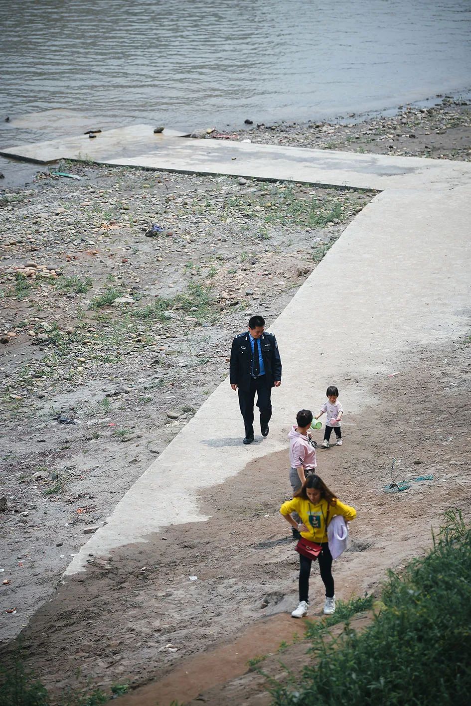 巡护完上岸的刘鸿,跟河边玩耍的孩子打招呼