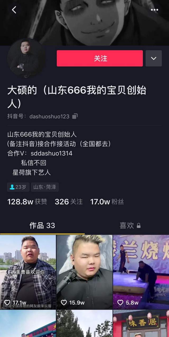 在停不下来的“曹县”再创作中,没有人注意到,抖音博主“大硕的”已默默在名字后面加上了“山东666我的宝贝创始人”,摇身一变“星荷旗下艺人”,并在简介中表示“接合作接活动,全国都去”。