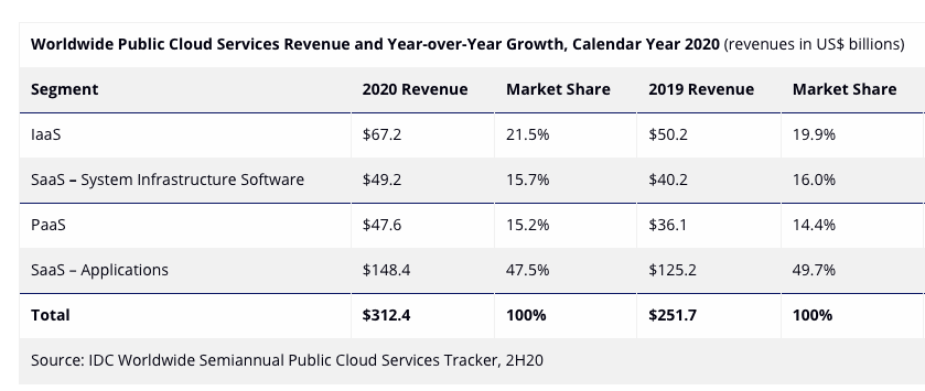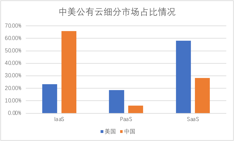 在上图中,可以清楚看到:2019年美国云计算权重最高的为SaaS(软件即服务),其余PaaS(平台即服务)和IaaS(基础设施即服务)分割剩余市场(IaaS市场占比略高,但差距不大),我国则恰恰相反,同年IaaS占据大半公有云市场,较之美国SaaS市场占比差距有天壤之别。