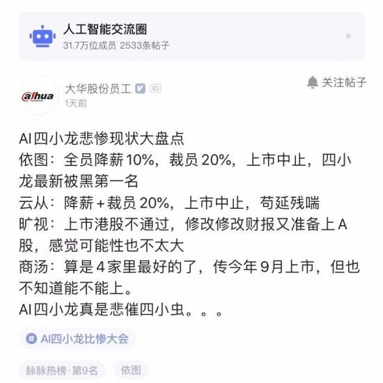 5月20日,AI四小龙比惨大甚至会登上了脉脉热榜。不难发现,曾受资本簇拥的四小龙几年间早已跌落神坛,AI企业的日子实际上过得也大不如前。如今,AI行业已然步入深水区,未来如何找到更合适的前进路径,成为了全行业共同关注的焦点。