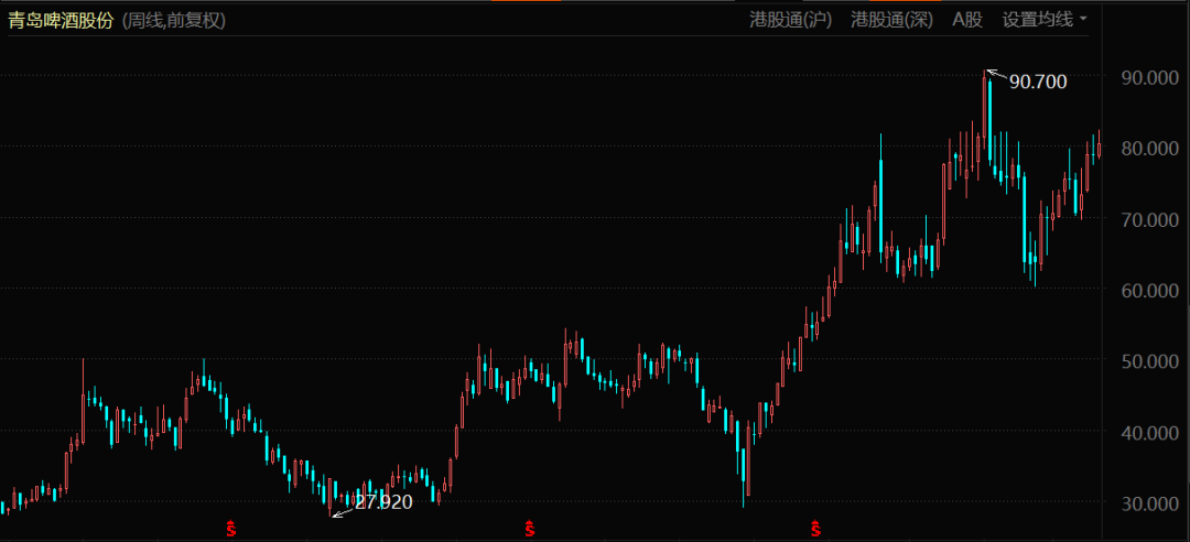 随后几个月时间里,复星越卖,青岛啤酒的股价越涨,到2021年1月最高升至90.7港元/股,相比27港元的买入价格已经翻了三倍有余。截至今年5月初,复星通过减持已经成功套现72亿港币(约合60亿元人民币)。