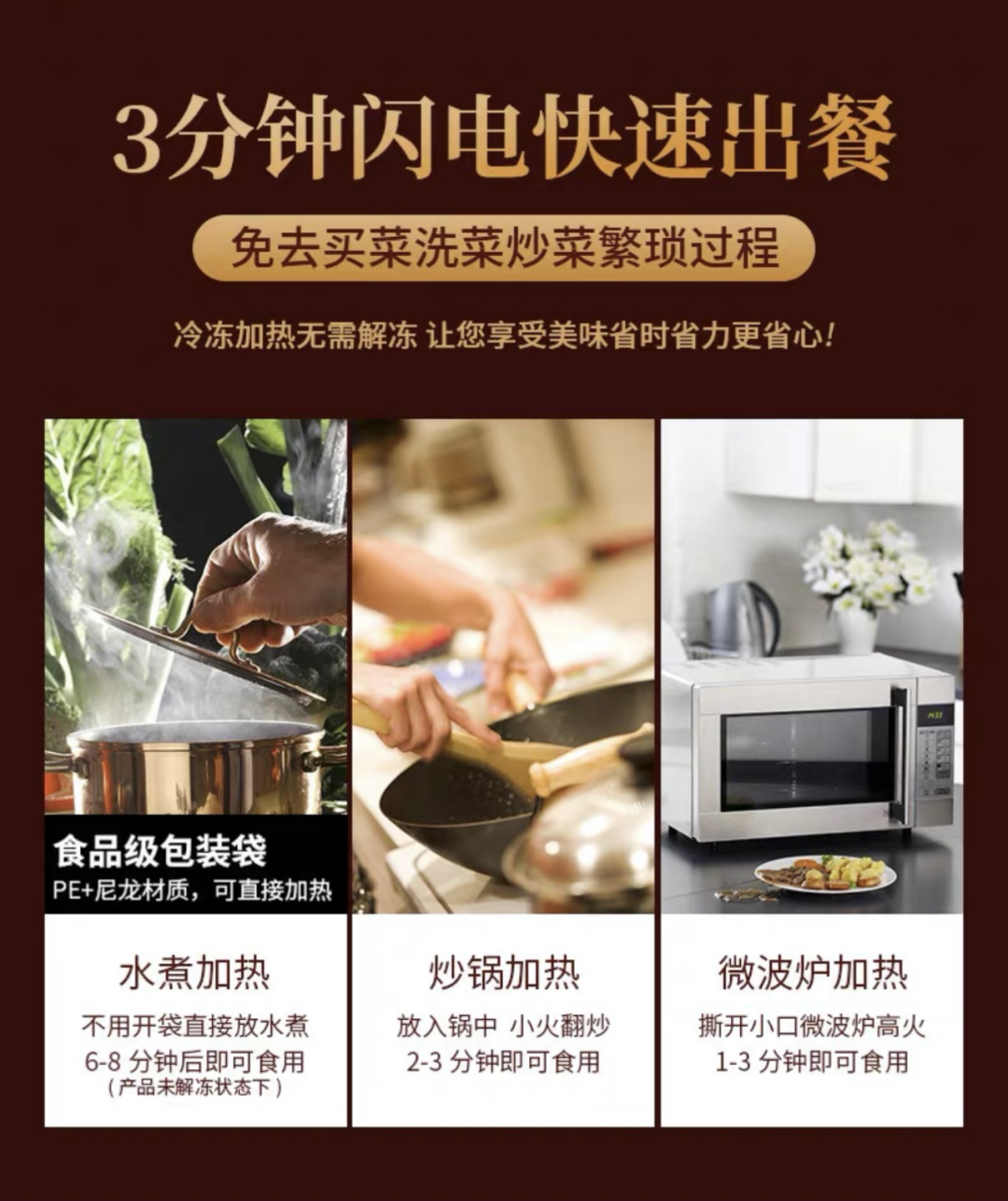 就像下图料理包商家淘宝详情页的广告宣传语:3分钟闪电快速出餐,免去了买菜洗菜炒菜的繁琐过程。
