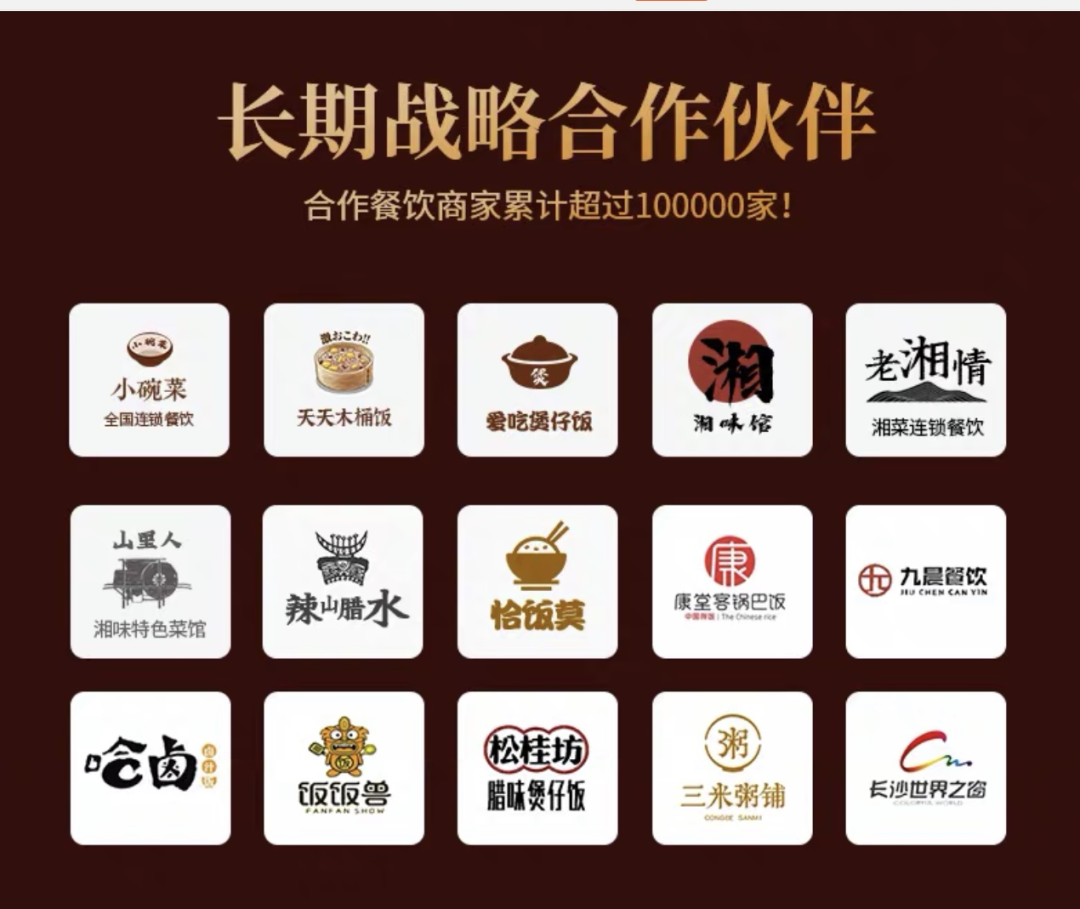 细看详情页,不少知名湘菜馆都和店家是长期合作伙伴。商家给出的数字是“十万家”合作餐饮商家。