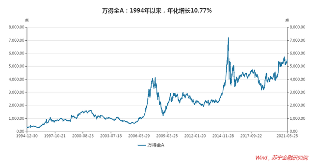 A股市场虽然常被投资者吐槽,但从长期持有的视角看,A股的赚钱效应丝毫不输美股。以覆盖沪深两市的万得全A指数来衡量,1994年-2020年,指数年化增幅为10.77%。这是个相当不错的成绩,若加上股息率,还要更高一些。只不过指数波动太大,大多数投资者因不能长期持不赚反亏罢了。