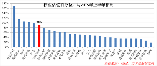 具体来看,与2015年上半年相比,当前市场估值的平均分位值为90%,仍不及2015年上半年的热度。分行业来看,超过100%的有四个行业,分别为食品饮料(170%)、休闲服务(114%)、银行(104%)和家用电器(102%),此外,汽车行业的估值热度也较高,为98%。