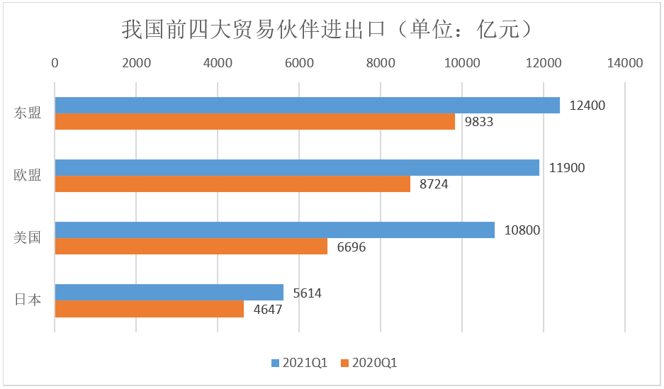 图:我国与主要贸易伙伴进出口保持高速增长,尤其是与美国的同比增速高达61.3%(数据来源:海关总署)