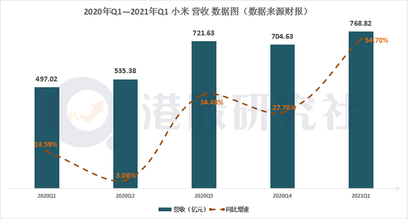 2021年一季度,小米营收实现768.82亿元,同期增长54.7%,超出市场及分析师的预期范围,这也主要受益于智能手机及物联网产品销量提升。