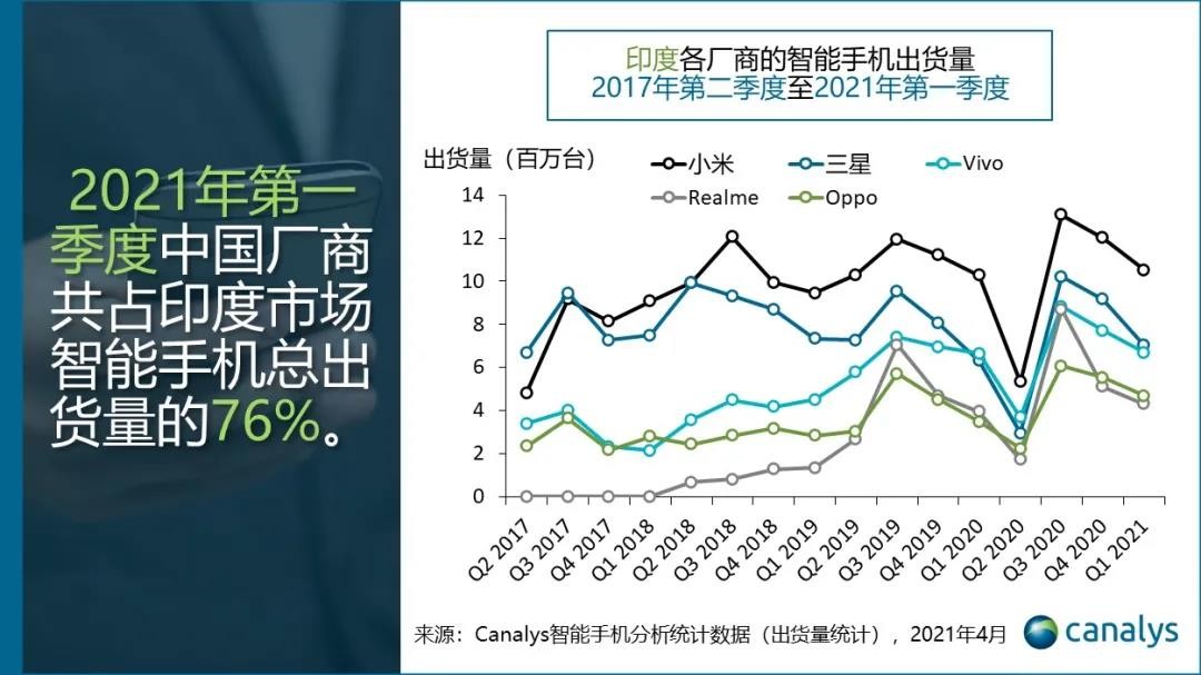 虽然小米在财报电话会议上有强调,印度市场的疫情重返,对小米的出货量没有很大的影响。但是从其近期连续几个季度在印度的出货量表现上来看,实际上小米在印度市场上的出货量已经处于下滑的趋势。