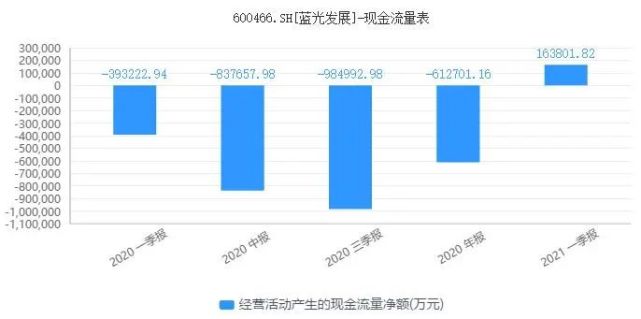 同花顺iFinD显示,从2020年一季度开始,蓝光发展经营活动产生的现金流量净额就连续为净流出状态,一季度流出39.32亿元,二季度净流出83.77亿元,三季度净流出98.49亿元,年底净流出61.27亿元。