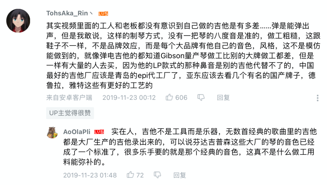 记录片下的热门评论,也表达了对山东吉他的不看好。甚至,还延伸出了关于乐器质量的“地图炮”:比如美国>欧洲>墨西哥、日本>韩国>中国、印度尼西亚。