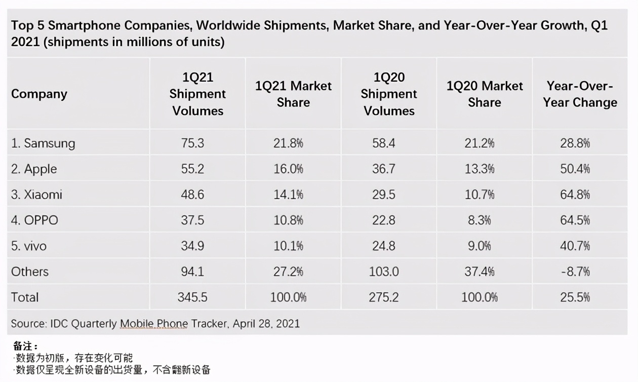 据IDC发布的2021年Q1全球手机市场份额,华为已经从去年同期的第二名,掉出前五,被归为“Others”一类。Canalys报告带来的消息更坏:华为一季度以1860万台的出货量,位居全球市场第七名,而去年同期的排名为第二。