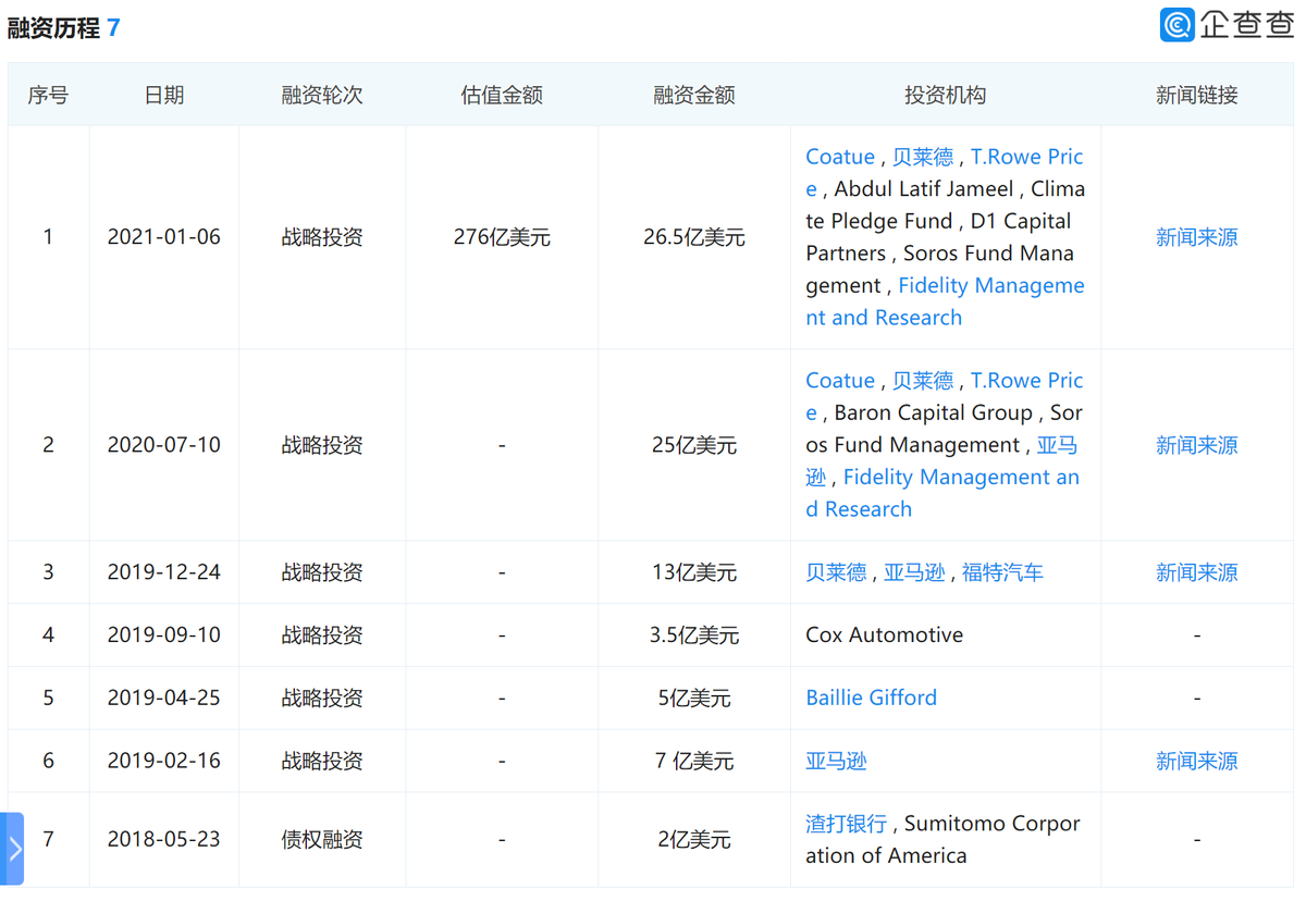 产品方面,Rivian主要生产R1T电动皮卡和R1S SUV,目前拥有超过3600名员工。据企查查显示,Rivian成立至今已经历过7轮融资,有亚马逊和福特汽车参投,最新一起融资发生在今年1月,当时的估值为276亿美元,目前最新估值已经达到700亿美元。