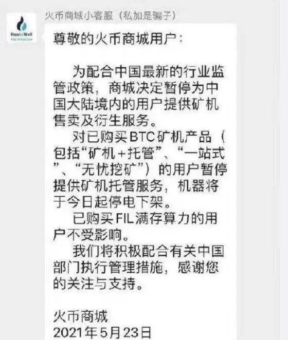 5月23日,火币网宣布为配合最新监管政策,暂停为中国大陆境内的用户提供矿机及衍生服务;对已购买BTC矿机产品的用户暂停提供矿机托管服务,机器当天停电下架。