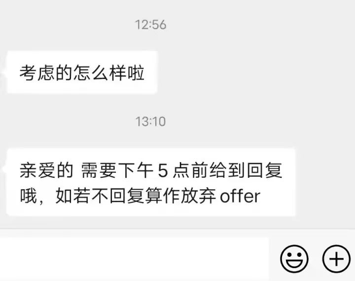 但5月28日下午,HR突然打电话给我,他说话很急,我身边当时也很吵,就断断续续听说暑假满员,让我放弃offer。第二天中午发消息给我:如果我不回复,就是默认放弃。