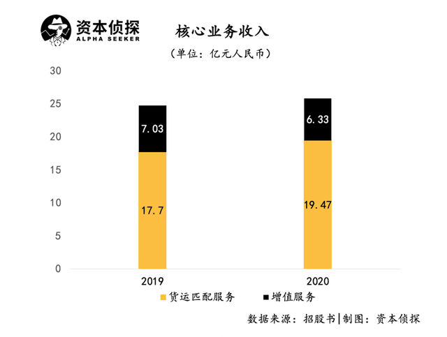 从业务结构来看,满帮的收入来自为货运匹配的经纪收入、会员收入,以及附加的信贷、保险等增值服务。其中,货运匹配业务是满帮的核心业务,在2019年、2020年分别贡献17.7亿元、19.5亿元,占其总营收的71.6%和75.5%。