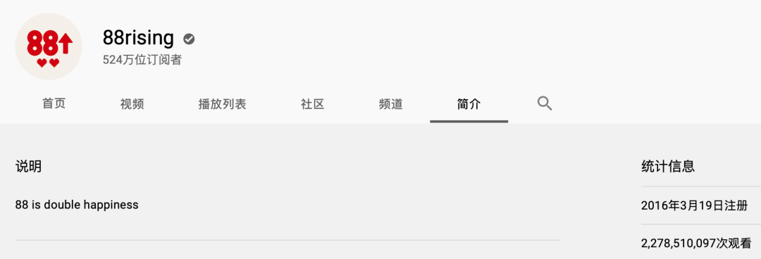 88rising的成功,不仅来源于对优质音乐人和其作品的发掘,还与其在全球最大的视频流媒体平台YouTube上的运营密不可分。2016年3月,88rising在YouTube上创建了自己的自媒体频道,截至目前,账号粉丝数已超过524万,观看次数更是达到了22.7亿次,其旗下的艺人Rich Brian和Joji在YouTube上也都有上百万粉丝。