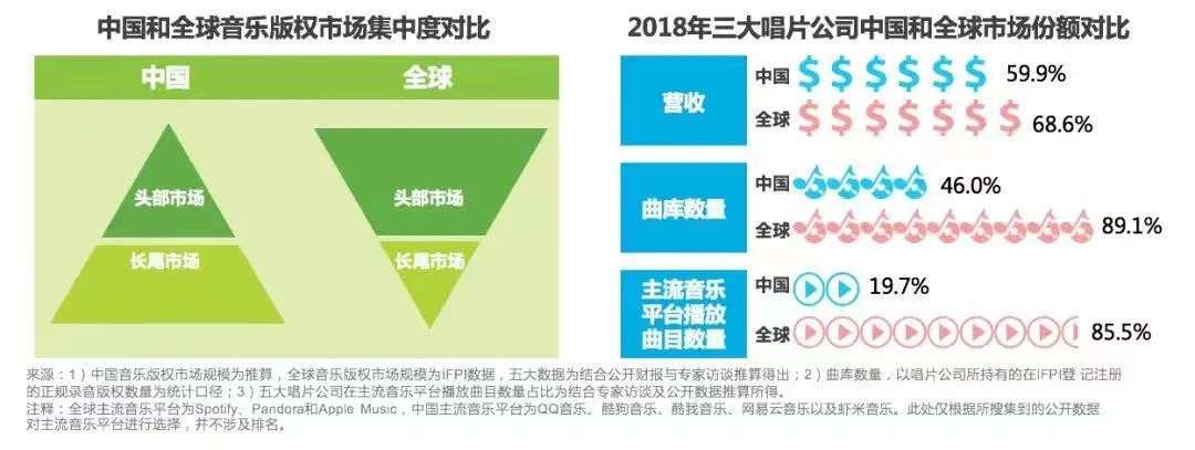 经过多年的激烈竞争以及一系列兼并收购,这三家巨无霸公司成为全球音乐市场的佼佼者,坐拥巨大的艺人和版权资源,其所拥有的曲库数量在全球录制音乐市场中的占比一度超过89%。在中国,虽然三大唱片公司所拥有的版权占比没有超过50%,但国内市场近6成的版权收入最终还是落入他们的口袋。
