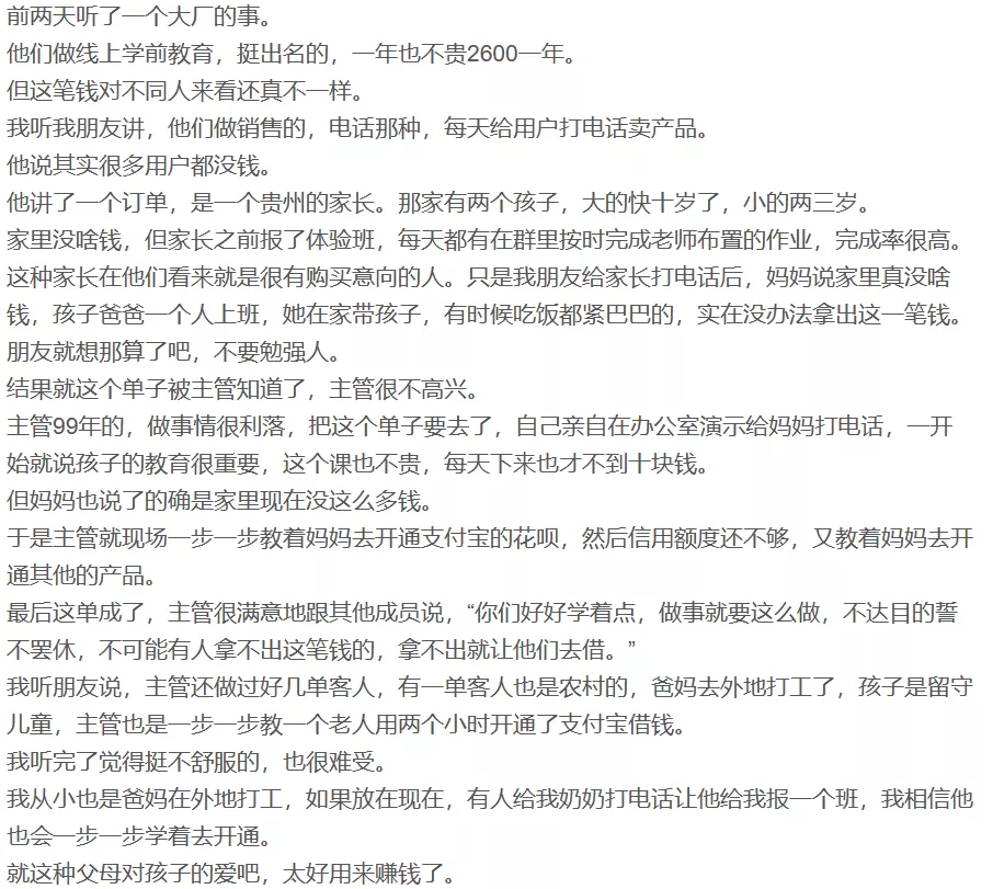 5月中旬,豆瓣一位用户的分享掀起热议。这位用户称,某在线教育公司的一位主管,为了让一位家境并不富裕的家长买定价2600元的课,一步一步教妈妈开通支付宝花呗,当信用额度不够时,又教这位妈妈开通其他网贷产品。