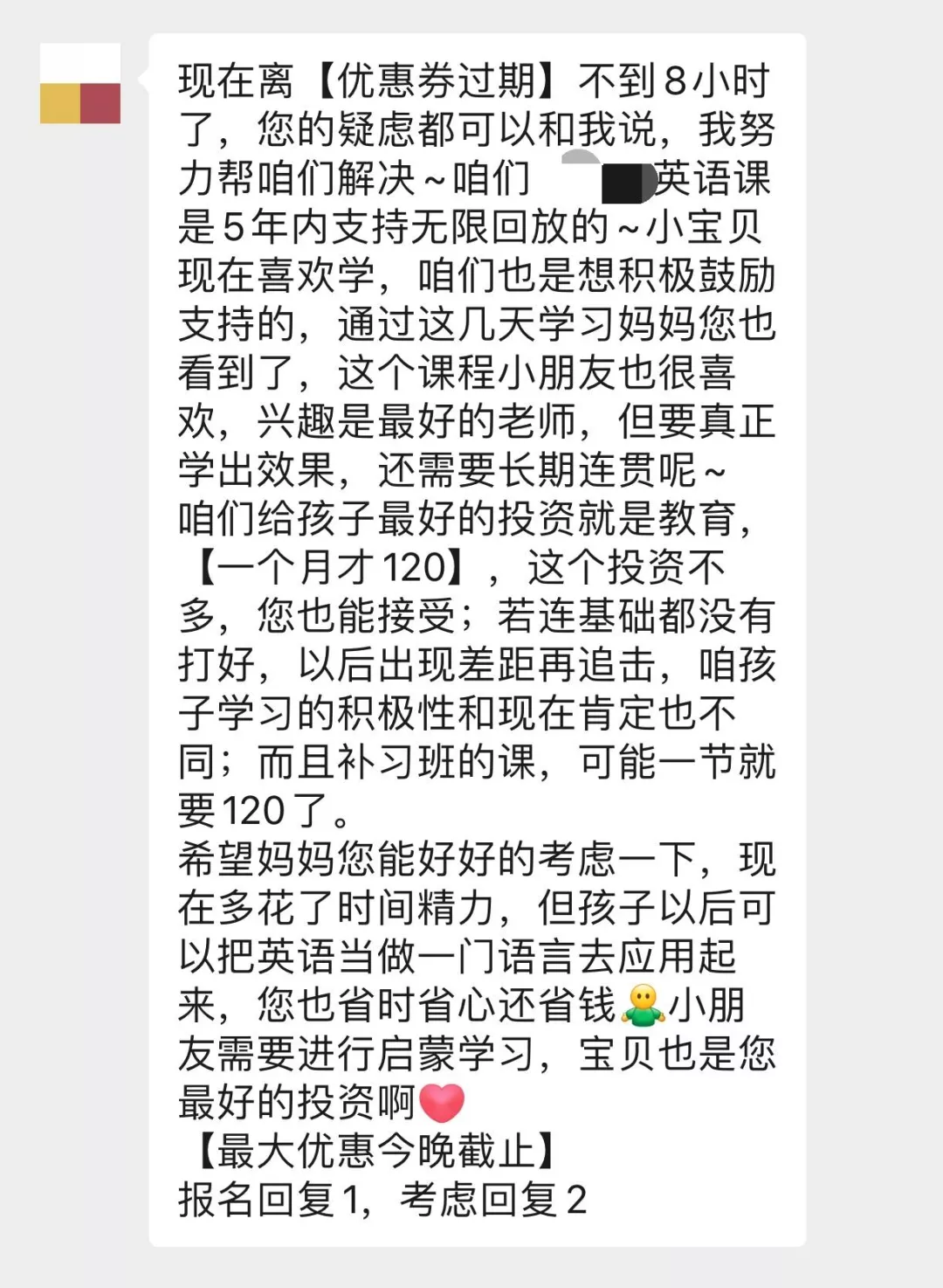 此外,文婷曾收到辅导老师的私信:“同龄的宝贝已经开始学习,走在了前面。”此话言外之意是,如果文婷不报名,就会让孩子落后。张茹也收到了类似的私信:“不希望您的孩子被落下”、“我说这么多,我是怕您错过这个提升孩子成绩的机会!”还有辅导老师“训斥”家长:“学习永远不是亡羊补牢的事情,难道要孩子一直追着别人跑吗?”