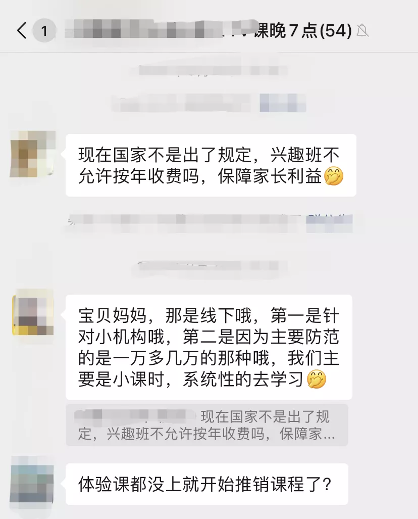 最让家长不放心的是,一些辅导老师在专业性方面还有待加强。比如,文婷所在的美术体验课程家长群内,有家长问及:“现在国家不是出了规定,兴趣班不允许按年收费,保障家长利益?”该课程老师表示,这个规定一来是针对线下机构,二来主要是防范几万元的大额课程。