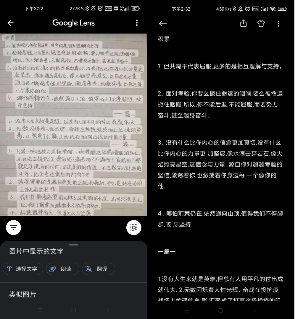 最后,我们来试试国产厂商自带的文本提取功能。以小雷常用的小米10为例,小米相机、「传送门」和「扫一扫」里的文档功能,均可以对图片进行文本识别。实际体验下来,小米相机对印刷体和手写体的文本识别率都还不错,作为文本识别功能而言绝对是合格的。