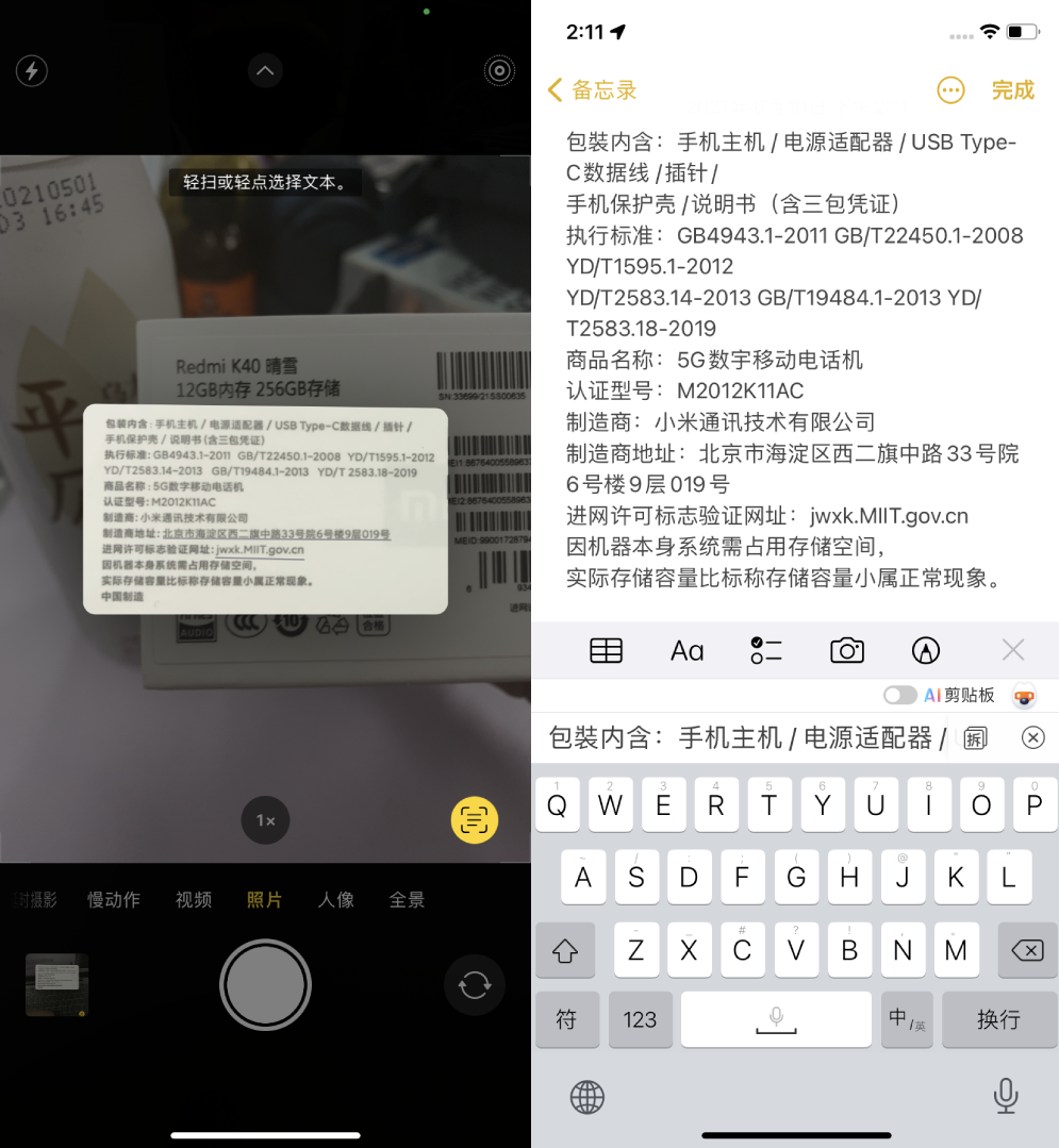 首先,苹果的「实况文本」是整合在相机里面的,用户可以打开相机、打开相册或是使用备忘录里的「来自相机的文本」选择使用该功能。实测iPhone可以自动识别出画面中的文字,点击按钮即可提取自己想要的文字,还可以对提取出来的文字进行查询、翻译、拷贝、共享等操作。从结果来看,苹果「实况文本」对印刷体的文本识别率还是很不错的,对中文手写体的文本识别率就不太理想了,需要改进。