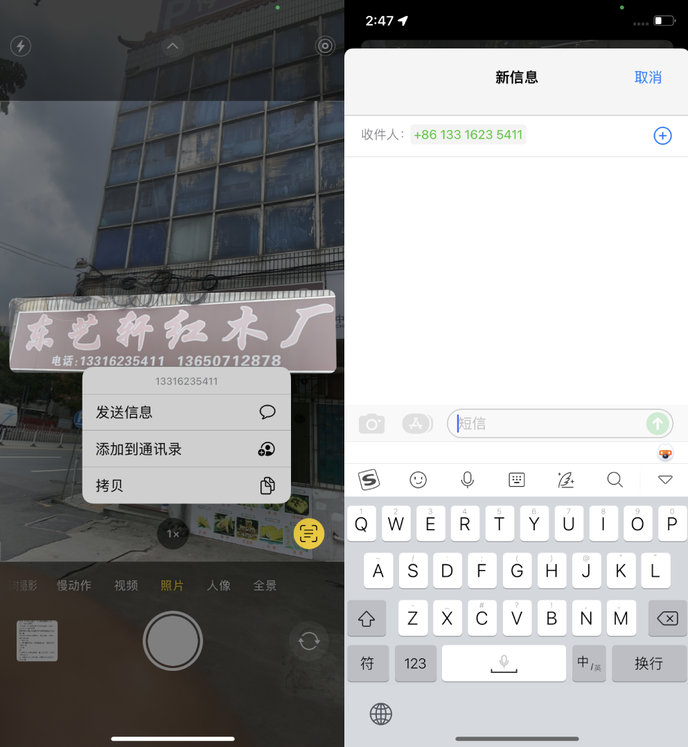 此外,苹果提取的「实况文本」还会自动识别号码、网址和地址并生成超链接。点击网址,即可跳转对应网站;点击地址,就会打开对应地址的地图信息;点击号码,则可以选择发送短信、添加到联系人,用起来还是挺方便的。