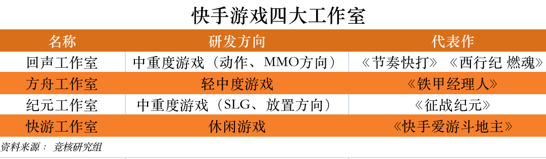 据了解,快手在游戏业务上设立了回声工作室、方舟工作室、纪元工作室、快游工作室。与字节跳动游戏业务大面积曝光相比,快手游戏业务无疑神秘得多。