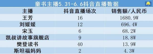其中表现最亮眼的是著名主持人王芳。飞瓜数据显示,5月31日到6月6日期间,王芳共直播16场,累计销售额为1680万元,与其他主播的销售额拉开了不止一个量级。另一位主播“斯坦福妈妈”7天直播2次,表现和数据都相对佛系;而“樊登读书”可以看作是童书界的品牌自播,属于循环直播的形式,七天直播40场。