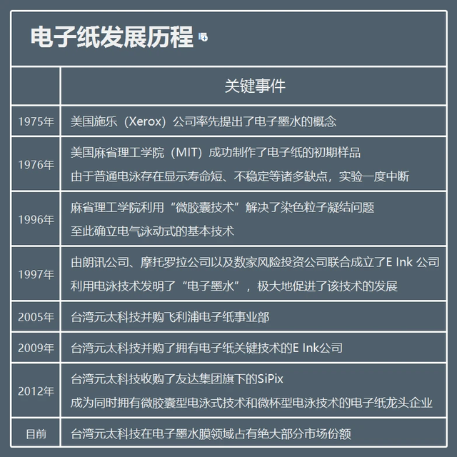 再加上Eink电子墨水技术在2008年开始实现量产,次年元太科技就做出了一个惊人之举,那就是,收购电子纸上游技术企业E-Ink。
